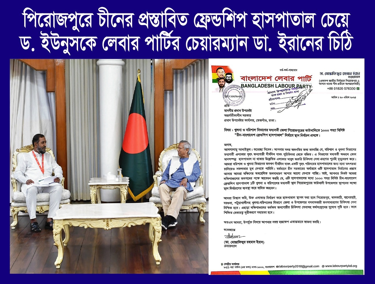 পিরোজপুরে জন্য চীনের প্রস্তাবিত হাসপাতাল চেয়ে ডক্টর ইউনুসকে লেবার পার্টির চেয়ারম্যান “ডাঃ ইরানের চিঠি