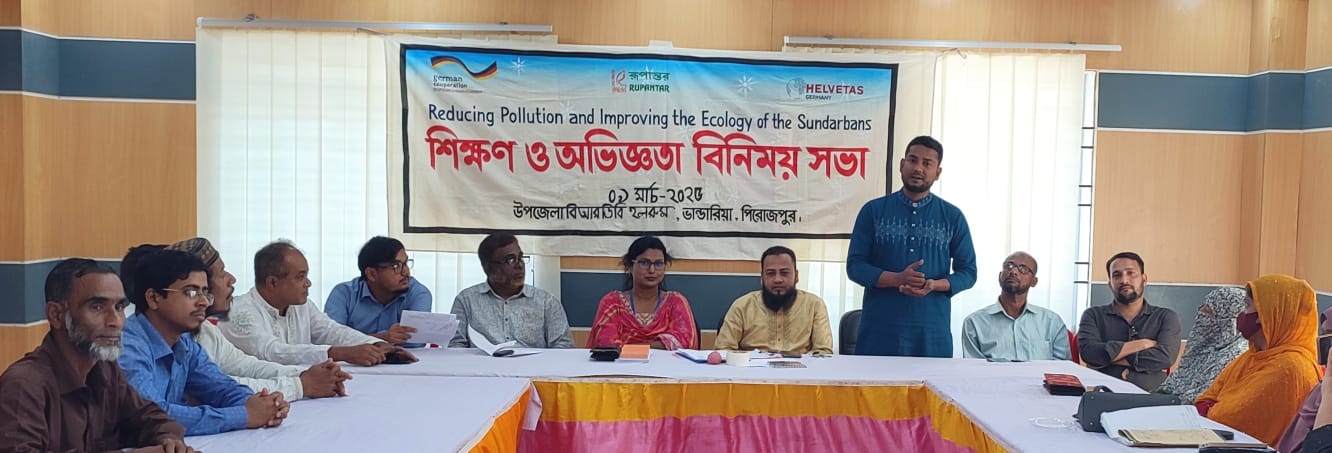 পিরোজপুরের ভান্ডারিয়ায় বেসরকারি সংগঠন রূপান্তর এর “সুন্দরবন ম্যানগ্রোভ বন ও তার সংলগ্ন অঞ্চলসমুহের পলিথিন ও প্লাষ্টিক দূষণ কমানো এবং বাস্তুসংস্থান উন্নয়ন” প্রকল্পের শিক্ষা ও অভিজ্ঞতা বিনিময় সভা অনুষ্ঠিত হয়েছে।
